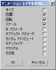 [位置](Position)、[回転](Rotation)、および[スケール](Scale)トラックは、既定値ではオンに設定されています。なお、このダイアログ ボックスでオフになっているアトリビュートもアニメートすることはできますが、レイヤ コントローラではコントロールできません。
