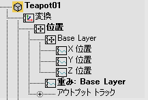 アニメーション レイヤを有効にする場合はコントローラ名が一部変更されるため、再マップが必要です。たとえば、アニメーション レイヤを有効にする前の球の[X 位置](X Position)トラックが Sphere01¥Transform¥Position¥X Position の場合、アニメーション レイヤを有効にした後の球の[X 位置](X Position)トラックは、Sphere01¥Transform¥Position¥Base Layer¥X Position に変更されます(コントローラ名にレイヤ名が挿入されます)。