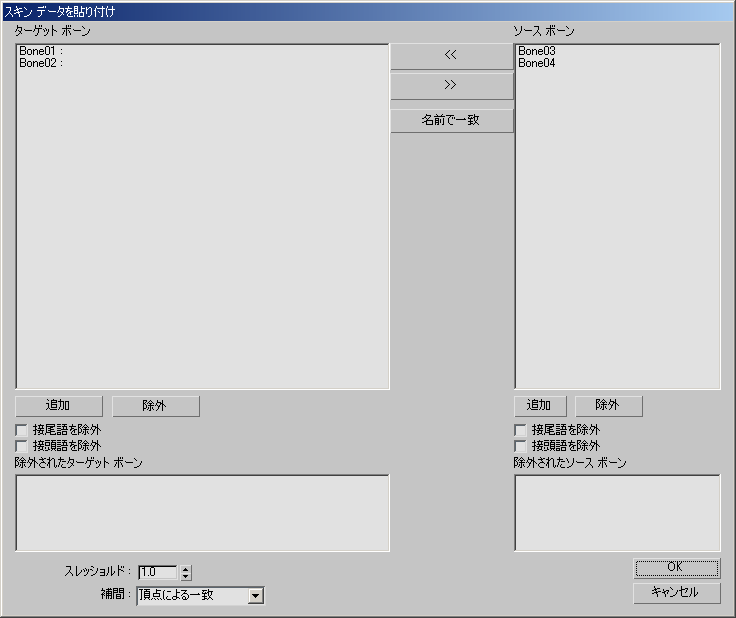 ソース ボーンとターゲット ボーンが名前で突き合わされます。接頭語か接尾語を除外し、表示されているソース ボーン名とターゲット ボーン名を完全に一致させた場合に限って、このオプションを使用できます。