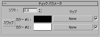2 色のチェッカーボード パターンをマテリアルに適用します。チェック マップは 2D 手続き型マップです。既定パターンは黒と白の正方形です。コンポーネント チェックはカラーかマップのいずれかになります。
