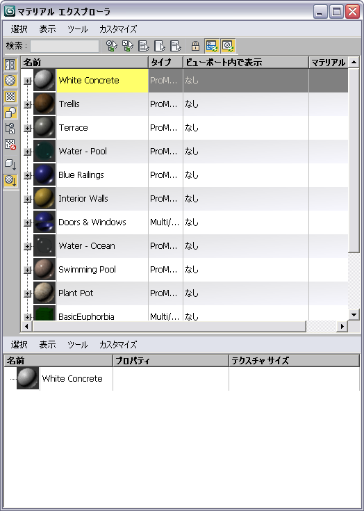 マテリアル エクスプローラでは、個別のマテリアルのプロパティを設定できますが、一度に表示できるマテリアルの数に限りがあります。マテリアル エクスプローラを使用すると、シーン内のすべてのマテリアルを参照したり、マテリアルが適用されているオブジェクトを確認したり、マテリアルの割り当てを変更したり、もしくはその他の方法でマテリアルを管理できます。
