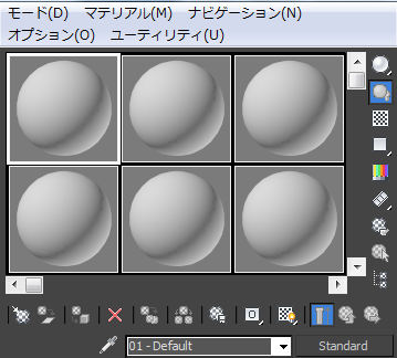 マテリアル エディタのサンプル スロットの上にはメニュー バーがあります。サンプル スロットの下および右に、マップとマテリアルの管理および変更に使用するボタンおよびその他のコントロールがあります。