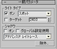この[一般パラメータ](General Parameters)ロールアウトは、標準ライト用に表示されます。これらのコントロールによって、ライトのオンとオフの切り替え、シーン内のオブジェクトの除外と取り込みを行います。