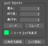 [エッジ](Edge)サブオブジェクト レベルでは、1 つまたは複数のエッジを選択し、標準の方法を使用して変換することができます。このトピックでは、[ジオメトリを編集](Edit Geometry)および[エッジを編集](Edit Edges)ロールアウトについて説明します。その他のコントロールについては、編集可能ポリゴンを参照してください。