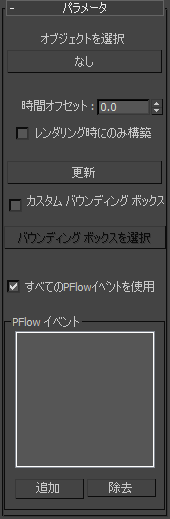 チェックマークが付いている場合にメッシャをパーティクル フロー システムに適用していると、システム内のすべてのイベントのためにメッシュ オブジェクトが自動的に作成されます。