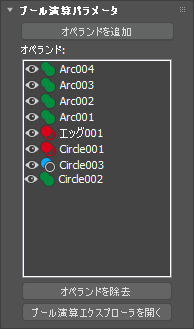合成シェイプの作成に関係するオペランドが表示されます。色つきのアイコンは、[オペランド パラメータ](Operand Parameters)ロールアウトに表示されている現在実行中のブール演算を示します。各オペランドの表示/非表示は、目のアイコンをクリックして切り替えることができます。