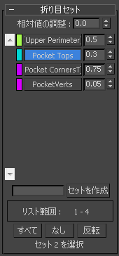 頂点またはエッジを選択した場合、折り目セットとして保存することができます。このロールアウトでは、折り目セットを管理し、それらの値を調整するためのコントロールを提供します。