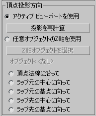 アクティブになっているビューポートの投影方向を再計算します。この方向はラップ先オブジェクトを選択したときに初めて割り当てられるので、割り当てた後にビューポートを変更する場合は、このボタンをクリックして新規のアクティブ ビューポートに基づいて方向を再計算します。