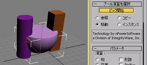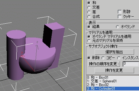 結果は、球と大きいボックスの交差と小さなボックスの和(追加)となります。ここでも、結果には元のオブジェクトのカラーが割り当てられます。