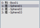 ブール演算オブジェクトの作成に使用したオペランドと操作のすべての履歴が、[パラメータ](Parameters)ロールアウトの最下部の階層ビュー リストに表示されます。Box01 のブール演算は[和](Union)で開始され、Sphere01 が[交差](Intersection)で組み込まれ、Box02 が[和](Union)で組み込まれ、最後に Cylinder01 が[差](Subtraction)で組み込まれました。