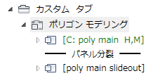 階層のこのレベルには、[パネル分裂](panel break)で仕切られた 2 つのサブパネルがあります。(サブパネルには アイコンが使用されます。これはパネルのセクションで、通常は関連するツールが含まれています。)[C: poly main H,M]という名前のサブパネルには、パネルの表示される部分が含まれます。[パネル分裂](panel break)の後の 2 番目のサブパネルには、リボンのパネル タイトルをクリックすると展開される部分が含まれます。