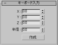 [キーボード入力](Keyboard Entry)ロールアウトを使って、キーボードで多数のジオメトリック プリミティブを作成できます。一度の操作で、オブジェクトの初期サイズと 3 次元の位置を定義できます。3ds Max がオブジェクトの名前と色を自動的に割り当てます。「オブジェクト名とワイヤフレーム カラー」を参照してください。