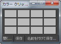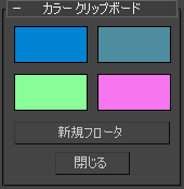 スロットが 12 個ある浮動クリップボードと、カラー クリップボード ファイルを開いたり保存したりするためのボタンを表示します。必要な数のフロータを開いたり、最小表示にしたりできます。[ユーティリティ](Utilities)パネルを閉じるか、[閉じる](Close)ボタンを選択して[カラー クリップボード](Color Clipboard)ユーティリティを終了すると、表示されているフロータは開いたまま残ります。フロータを閉じると、変更された値はすべて失われます。