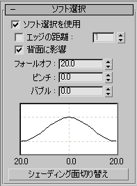 このダイアログ ボックス内のコントロールを使用すると、[ソフト選択](Soft Selection)パラメータを修正できます。すべてのサブオブジェクト レベルは、同じ[ソフト選択](Soft Selection)パラメータ値を使用します。ソフト選択は、NURBS、メッシュ、ポリゴン、パッチ、およびスプライン オブジェクトで使用できます。