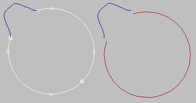 - [閉じる](Closed) このチェック ボックスにチェックマークが付いている場合、新しいスプラインの最初の頂点と最後の頂点を接続して閉じたスプラインを作成します。[閉じる](Closed)にチェックマークが付いていない場合、[接続](Connect)では常に開いたスプラインが作成されます。