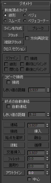この領域のラジオ ボタンを使用して、Shift +クローンで作成した、セグメントまたはスプラインの新規頂点の接線を決定します。[コピーで接続](Connect Copy)を後で使用する場合には、元のセグメントまたはスプラインから新しいセグメントまたはスプラインに接続する頂点には、この領域に指定されている頂点タイプが設定されます。