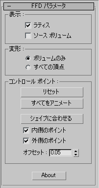 このサブオブジェクト レベルでは、ラティス ボックスの位置決め、回転、またはスケールをジオメトリとは別に行うことができます。[オート キー](Auto Key)がオンの場合、これを行うことでラティスがアニメートされます。 最初に FFD を適用したときのラティスは、ジオメトリを囲むバウンディング ボックスに既定値設定されています。頂点のサブセットだけがボリューム内にあるようにラティスを移動またはスケーリングすると、指定した位置に変形を適用できるようになります。