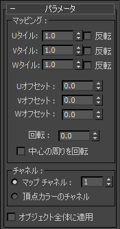 変換をマッピング チャネルまたは頂点カラー チャネルのどちらに適用するか、どのチャネルを使用するかを指定します。チャネルに関しては、[UVW マップ](UVW Map)モディファイヤを参照してください。