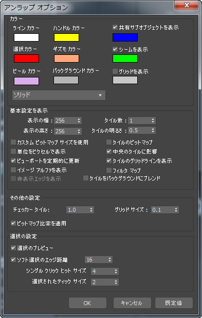 [アンラップ オプション](Unwrap Options)ダイアログ ボックスのコントロールを使って、[UVW アンラップ](Unwrap UVW)モディファイヤ エディタの基本設定を設定します。