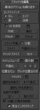 [ジオメトリを編集](Edit Geometry)ロールアウトには、トップ(オブジェクト) レベルまたはサブオブジェクト レベルのいずれかでポリゴン オブジェクトのジオメトリを変更するための、グローバル コントロールがあります。以下の説明に記述がある場合を除き、コントロールはすべてのレベルで共通です。