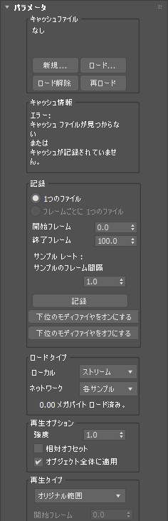 ディスク上のキャッシュ ファイルの頂点アニメーションを[ポイント キャッシュ](Point Cache)モディファイヤにロードします。キャッシュとオブジェクトで頂点の数が一致しない場合は、[キャッシュ情報](Cache Info)領域にエラーが表示され、アニメーションはロードされません。