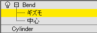 サブオブジェクト レベルでギズモをその他のオブジェクトと同じように変換およびアニメートして、[ベンド](Bend)モディファイヤの効果を変えることができます。ギズモを変換すると、中心も同じ距離だけ変換されます。ギズモの回転またはスケールは、中心と関連して行われます。