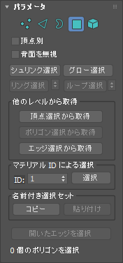 - [メッシュ選択](Mesh Select)の[パラメータ](Parameters)ロールアウトの下部には、現在の選択に関する情報が文字で表示されます。0 (ゼロ)または複数のサブオブジェクトが選択されると、選択された数と種類が表示されます。1 つのサブオブジェクトが選択されると、選択された項目の ID 番号と種類が表示されます。
