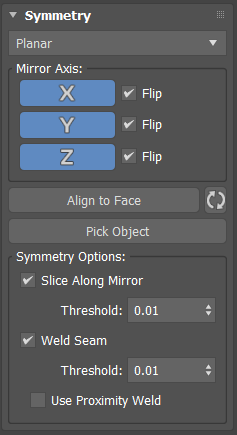 注: [シンメトリ] (Symmetry)モディファイヤは、モディファイヤ スタック内のパッチおよび NURBS オブジェクトをメッシュ形式に変換します。編集可能ポリゴン オブジェクトと編集可能メッシュ オブジェクトは変換されず、元の形式のままです。