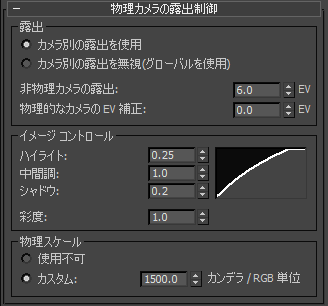 - 物理カメラの[露出値](Exposure Value)を設定します。既定値は 0.0 ですが、既定値では、各カメラの EV 設定によってこの既定値が 6.0 に上書きされます。