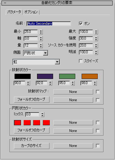 - 自動セカンダリ フレアを分配する軸の長さ全体を決めます。この値を大きくすると、フレア間のスペースが大きくなり、小さくすると、フレア間のスペースが小さくなります。軸は、0 度から 10 度まで設定できます。