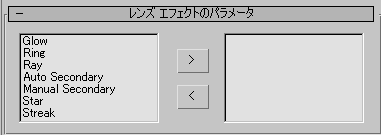 - 目的の効果を[レンズ エフェクトのパラメータ](Lens Effects Parameters)ロールアウトの左側のリストから選択します。