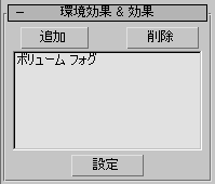 [環境効果 & 効果](Atmospheres & Effects)ロールアウトで、[追加](Add)をクリックします。[環境効果を追加](Add Atmosphere)ダイアログ ボックスが表示されます。 これにより、装置に対し環境効果の複製が作成されます。この設定は、選択した環境効果と同じ値に初期設定されます。これらの設定値は、[設定](Setup)を使用して調整できます。