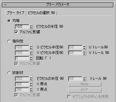 オブジェクト ボタン(既定値のラベル名は「なし」) オブジェクトを指定し、そのオブジェクトの中心をブラー効果の中心にします。これをクリックしてオブジェクトを選択してから、[オブジェクトの中心を使用](Use Object Center)にチェックマークを付けてください。オブジェクト名がボタン上に表示されます。