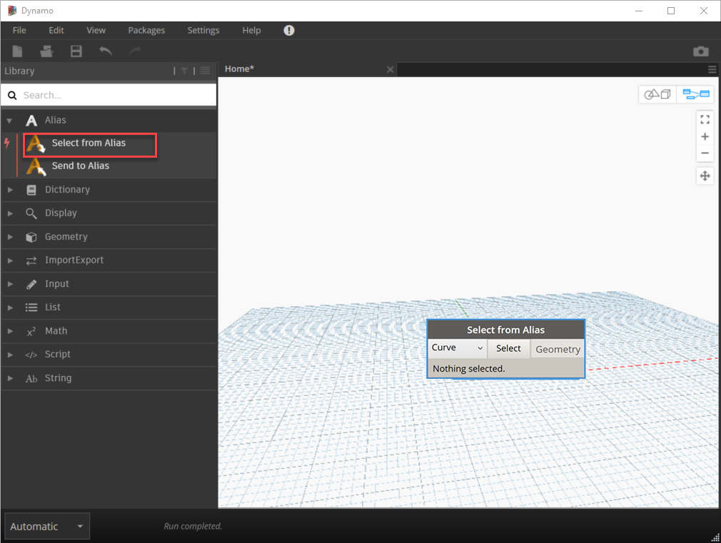 Dynamo の Select from Alias ノードに、要素が選択されたことが示されます。