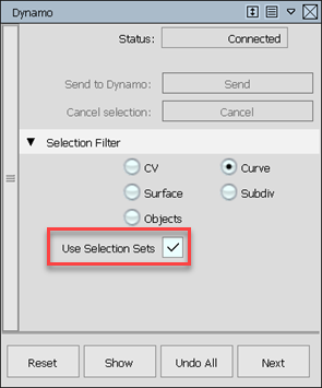 Dynamo オプション ボックスで Send をクリックし、選択項目を Dynamo に送ります。