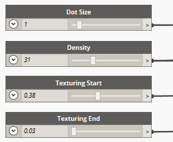 サンプル ファイルには、さまざまな値を調べる際に使用できるスライダが含まれています。たとえば、Wheel_With_History.wire ファイルに関連付けられている 02_Wheel_Texure.dyn ファイルには、次のスライダが含まれています。