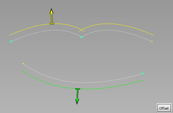 トポロジに基づいて、カーブ セットが作成されます。セットごとに異なる色のオフセット プレビューが表示されます。また、各セットには、オフセットの一体化された方向を示す矢印が表示されます。