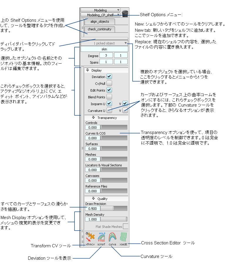 これら一連のオプションを使用して、カーブ、サーフェス、メッシュの表示を調整できます。