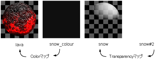 シーン中にあるすべてのオブジェクトに雪が降ったように見せるには、Snow テクスチャを Transparency マップとして白いシェーダ上に適用し、次にこのシェーダを他のシェーダにレイヤとして重ねます。この方法を使用すれば、雪に独自のシェーディング アトリビュート(属性)を持たせることができます。