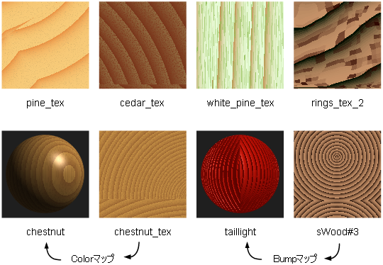 一般的には、一片の木材や大理石などの素材から削り出したオブジェクトを表現する場合に、Solid テクスチャを使用します。Solid テクスチャでは、サーフェスのそれぞれの点の XYZ 値に従ってサーフェスのカラーが定義されます。このため、Solid テクスチャはサーフェスのパラメータ設定の影響を受けず、パラメータ設定が均一でないサーフェスにマップしても、Surface テクスチャのように歪むことはありません。