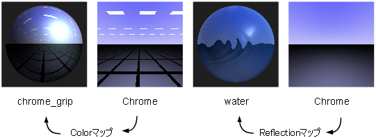 Chrome テクスチャはショールーム環境をシミュレートする。このテクスチャはグラウンド プレーンとスカイ プレーン(さらに蛍光灯ライトの四角形)から構成され、単純ながら、クローム サーフェスのリフレクションをシミュレートするための実用的な環境を提供する。