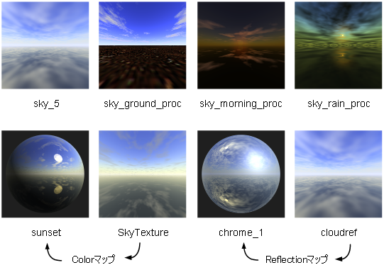 Enviromnent テクスチャの種類には、Ball、Chrome、Cube、Sky、Sphere があります。