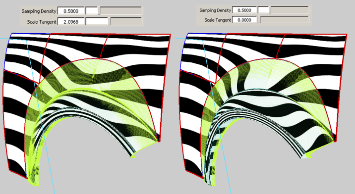 コンストレインの接線性の長さをスケーリングします。値を 0 にすると接線連続性になり、この値を増やすと、接線性の「長さ」が増加します。この値を調整して非整数値にすることも可能です。