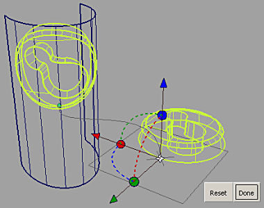 マニピュレータを使用して、ターゲットのオリジナルの位置と相対的に接触ポイントを移動することができます。接触ポイントの位置を変更すると、Conform されたターゲットが即座に更新されて変更の効果が表示されます。また、このマニピュレータを使用して、オリジナルのターゲットにある特定のポイントに接触ポイントをスナップすることもできます。これには、マニピュレータ中央にある薄青色のポイントをクリックします。このポイントが白くなったら、次の図のように、通常のカーブスナップ テクニックを使用して、オリジナル ターゲットの任意の部分に接触ポイントをスナップできます。
