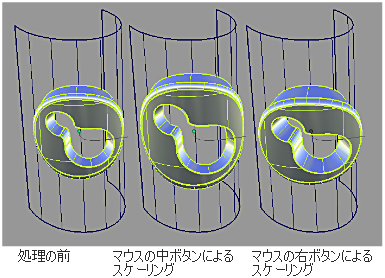 接触ポイントをスケーリング ピボットとして使用して、デスティネーションに相対的にターゲットのサイズを調整するには、Scale モードを使用します。この場合も、ターゲットがデスティネーションを超えて拡張されていれば、ツールによる接線的な外挿が行われます。ターゲットを比例的にスケーリングするには、マウスの左ボタンを使用(クリックして、左または右にドラッグ)します。デスティネーション サーフェスに沿ってスケーリングする(ターゲットの厚さはそのままで、サイズを大きくする)にはマウスの中ボタンを、ターゲットの厚みをスケーリングするにはマウスの右ボタンを使用します。