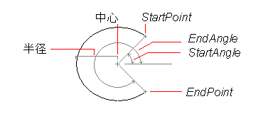 円弧は、常に始点から終点に向けて反時計回りに描かれます。円弧の StartPoint プロパティと EndPoint プロパティは、StartAngle、EndAngle、および Radius プロパティから計算されます。