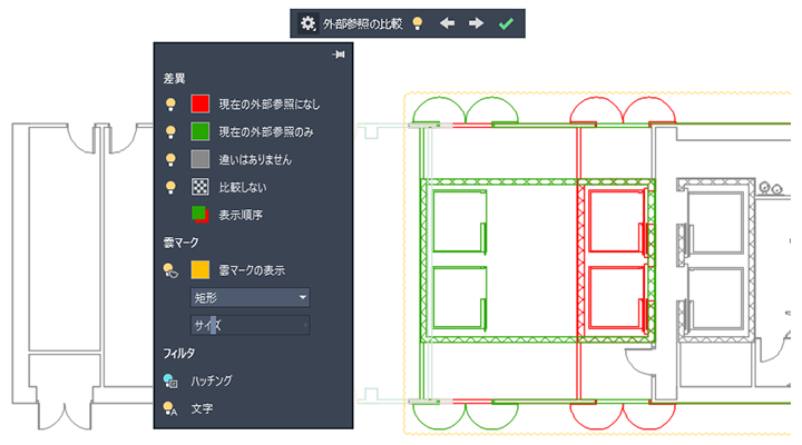 比較機能の主な強化点は、現在の図面に外部参照図面としてアタッチされている図面ファイルに加えられた変更を比較して確認できるようになったことです。参照図面または比較図面に対する変更は、雲マークを使用して強調表示されます。