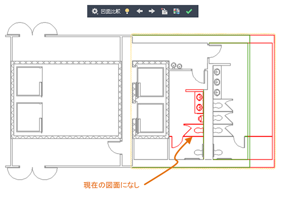 ハイライト表示されている相違部分(赤色)を比較図面から現在の図面に読み込むことができます。読み込むと、それらのオブジェクトは両方の図面に存在するようになり、自動的にグレーになります。現在の図面に読み込むことができるのは、現在の図面に存在しないオブジェクトのみです。