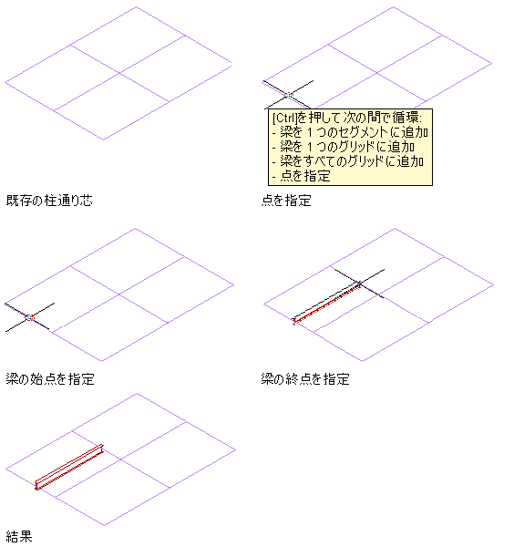 | 既存の構造部材に接続する梁を作成するには | 始点と終点を指定し、そのうちの一つは必ず軸上または既存の部材の終点に位置するようにします。[Enter]を押して、コマンドを終了します。 |