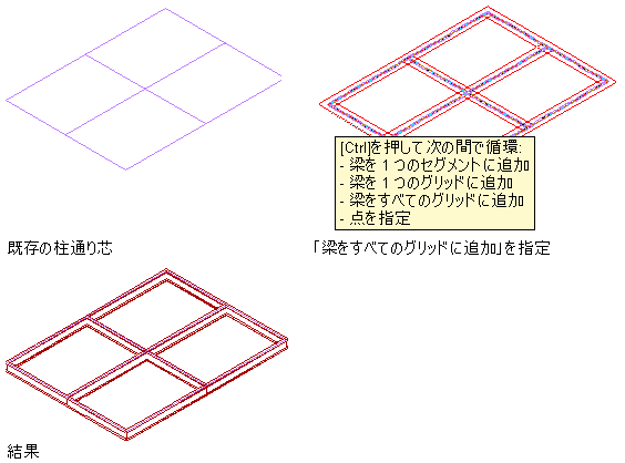 | 柱通芯の一つ以上のセグメントに沿って梁を追加するには([レイアウト タイプ]が[エッジ]の場合) | カーソルをグリッドのセグメント上で移動し、梁のプレビューを表示します。次にクリックしてセグメントに沿って梁を追加するか、または[Ctrl]キーを押してクリックし梁をそのグリッドのすべてのセグメントに沿って追加します。または[Ctrl]キーを 2 回押し、梁をそのグリッドのすべてのセグメントに沿って追加します。[Enter]を押して、コマンドを終了します。 |